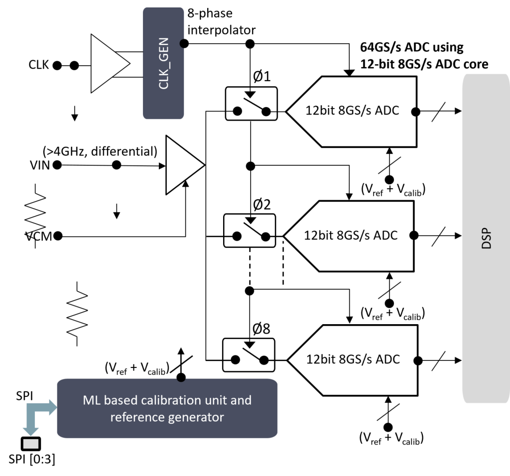 For example, here is a high-level block diagram of how 64 GS/s will be achieved using our 12-bit 8 GS/s ADCs and time interleaving them.